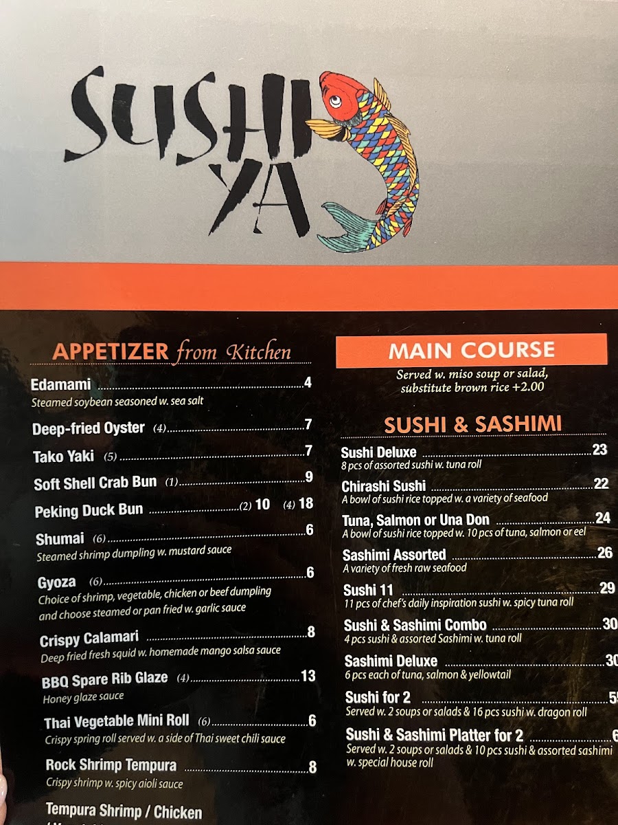 From a reviewer’s perspective, the menu at Sushi Ya Japanese Restaurant feels like a well-rounded conclusion to the restaurant’s identity, bringing together classic Japanese flavors and creative Asian-inspired dishes in a thoughtful way. The dining experience often begins lightly with salads such as Sushi Ya Salad, Kani Salad, Avocado Salad, Grilled Chicken Mango Salad, or Sashimi Salad, before moving into comforting kitchen appetizers like Peking Duck Bun 2 Pc, Age Tofu, Spicy Cucumber Cold Dish, Gyoza (6 Pieces), and Shumai (6 Pieces). Simple drinks such as Honey Iced Tea, Hot Tea, Coke, Strawberry Lemonade, and Diet Coke complement the meal without overpowering it. For heartier options, noodle and rice dishes like Chicken Stir Fried Udon, Beef Stir Fried Udon, Chicken Udon Soup, Shrimp Pineapple Fried Rice, and Beef Fried Rice provide warmth and familiarity. Sushi lovers will appreciate the balance between lighter vegetable rolls-Sweet Potato Tempura Roll, Peanut Avocado Roll, Cucumber Roll, Asparagus Roll, and Shitake Mushroom & Avocado Roll-and sushi bar starters such as Yellowtail Jalapeño, Sushi, Avocado Boat, Black Cod Sushi 2 Pc, and Seafood Ceviche. The roll selection expands further with regular rolls like Tuna Roll, Soft Shell Crab Tempura Roll, Salmon Avocado Roll, Salmon Roll, and Blue Crab Maryland Roll, alongside bold spicy options including Spicy Salmon Roll, Spicy Scallop Roll, Spicy Tuna Roll, Spicy Yellowtail Roll, and Spicy Blue Crab Roll. Entrées such as Red Curry Salmon, Thai Basil Sauce, Sesame Sauce, Peking Duck, and General Tso’s Sauce show Asian bistro influence, while platters like Vegetable Sushi, Sashimi Deluxe, Sushi & Sashimi Platter For 2, Sushi (11 Pieces), and Tuna Don highlight freshness and variety. The menu rounds out nicely with Chicken Teriyaki, Shrimp Teriyaki, New York Strip Teriyaki, Salmon Teriyaki, signature rolls like Tropical Roll, Asparagus Delight Roll, Spicy Girl Roll, Amazing Tuna Roll, and Crunchy Spicy Roll, plus comforting soups and tempura such as Miso Soup, Thai Tom Yum Soup, Shrimp Tempura (10 Pieces), and Vegetable Tempura, leaving diners with a complete and satisfying impression of Sushi Ya’s diverse offerings.